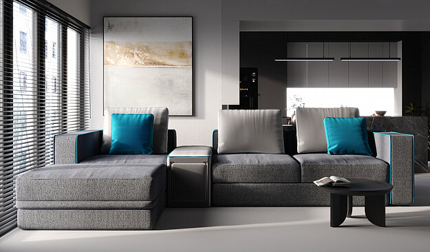 Наличие бара с нишей для хранения прохладительных напитков и журналов создаст уютную атмосферу во время приёма гостей. Бар оснащён системой амортизации, благодаря которой механизм закрывается мягко и бесшумно. Преимущество данного вида дивана заключается в возможности использования бара в качестве пуфика или журнального столика, который можно передвинуть в любое удобное место. Встроенный бар в диване «Амелия» поспособствует созданию уютной атмосферы для приёма гостей и станет приятным бонусом при оформлении зоны отдыха.